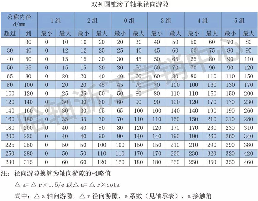 單列圓錐滾子軸承制造安裝后才有內部游隙,并在另一個以相反方向定位的軸承進行調節后才能確定。雙列圓錐滾子軸承徑向游隙按下表執行。